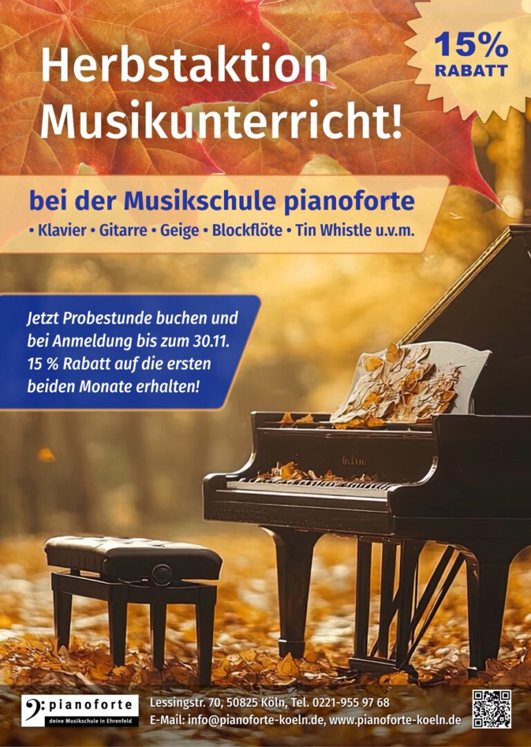 🍂 Lerne jetzt dein Lieblingsinstrument und sichere dir 15 % Rabatt auf die ersten beiden Unterrichtsmonate.
